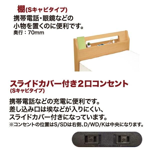 ※マットレス別売り 底板:布張り Sキャビタイプ(引き出し付き) 棚付き スライドカバー2口コンセント付き(中央) 立てかけ棚付き