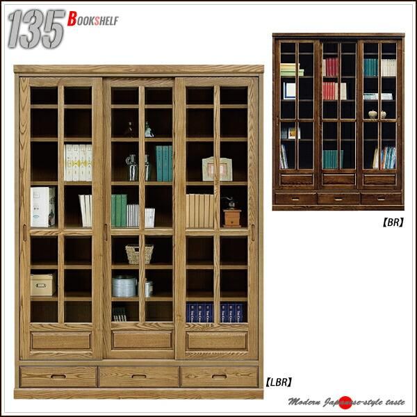 本棚 書棚 135 書庫 扉付き 無垢 扉付き本棚 高級 キャビネット タモ材 本収納 シェルフ ガラス扉 和風家具 大川家具 CD収納 日本製 巾135 完成品 北欧