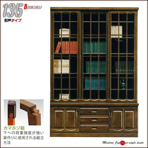 本棚 書庫 135 書棚 無垢 日本製 キャビネット 巾135 扉付き本棚 扉付き 高級 引き扉 和風家具 シェルフ 大川家具 CD収納 ガラス扉 北欧 完成品 本収納