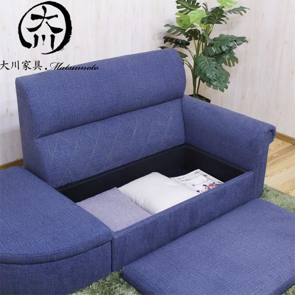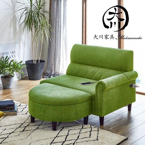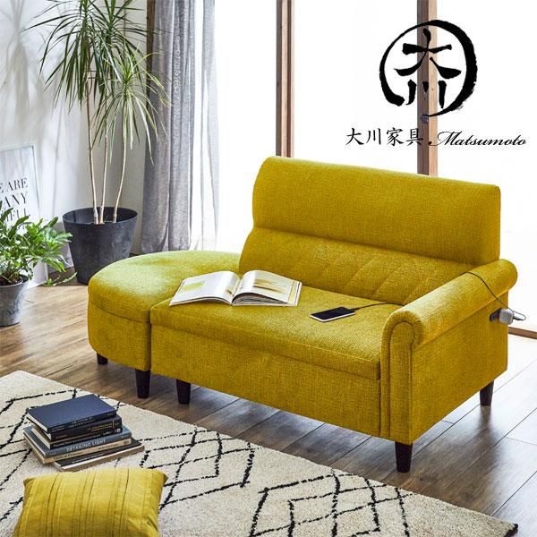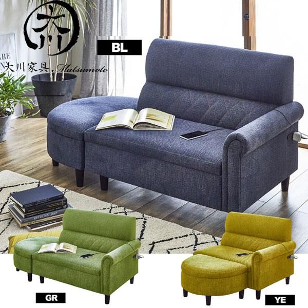 ソファ ソファー 2人掛け ローソファ フロアソファ 脚付き 肘付き 収納付き ブルー グリーン イエロー ファブリック コンセント付 大川家具matsumoto