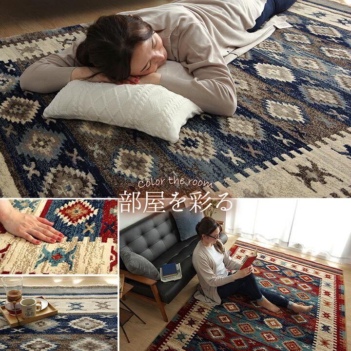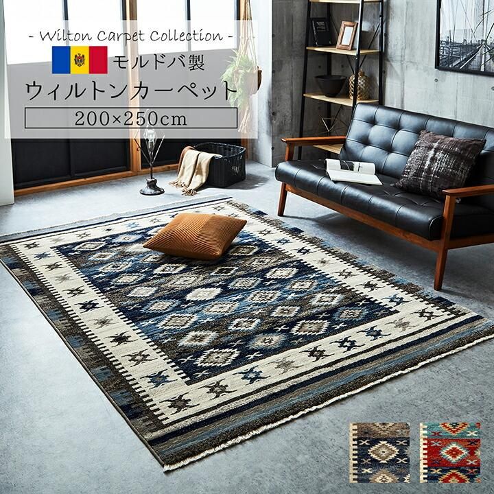 カーペット おしゃれ ラグ マット モルドバ ウィルトン 織り 畳める 約200×250cm 3畳 ネイビー レッド へたりにくい エスニック