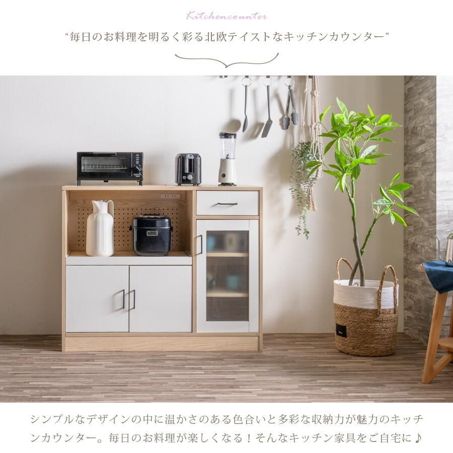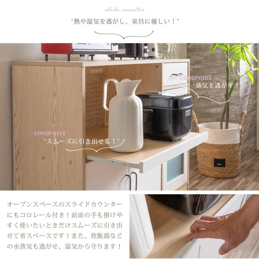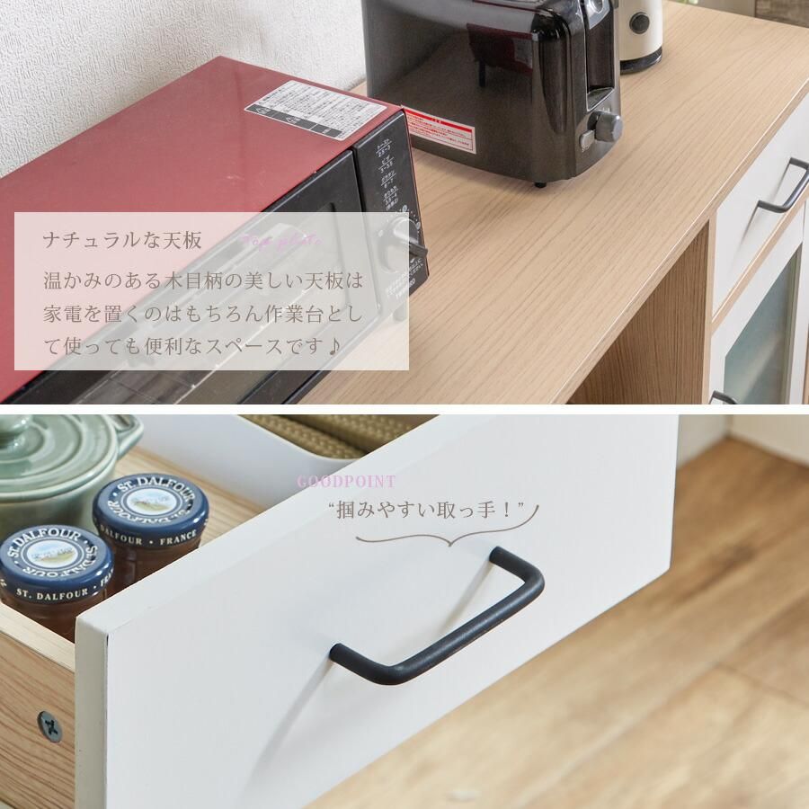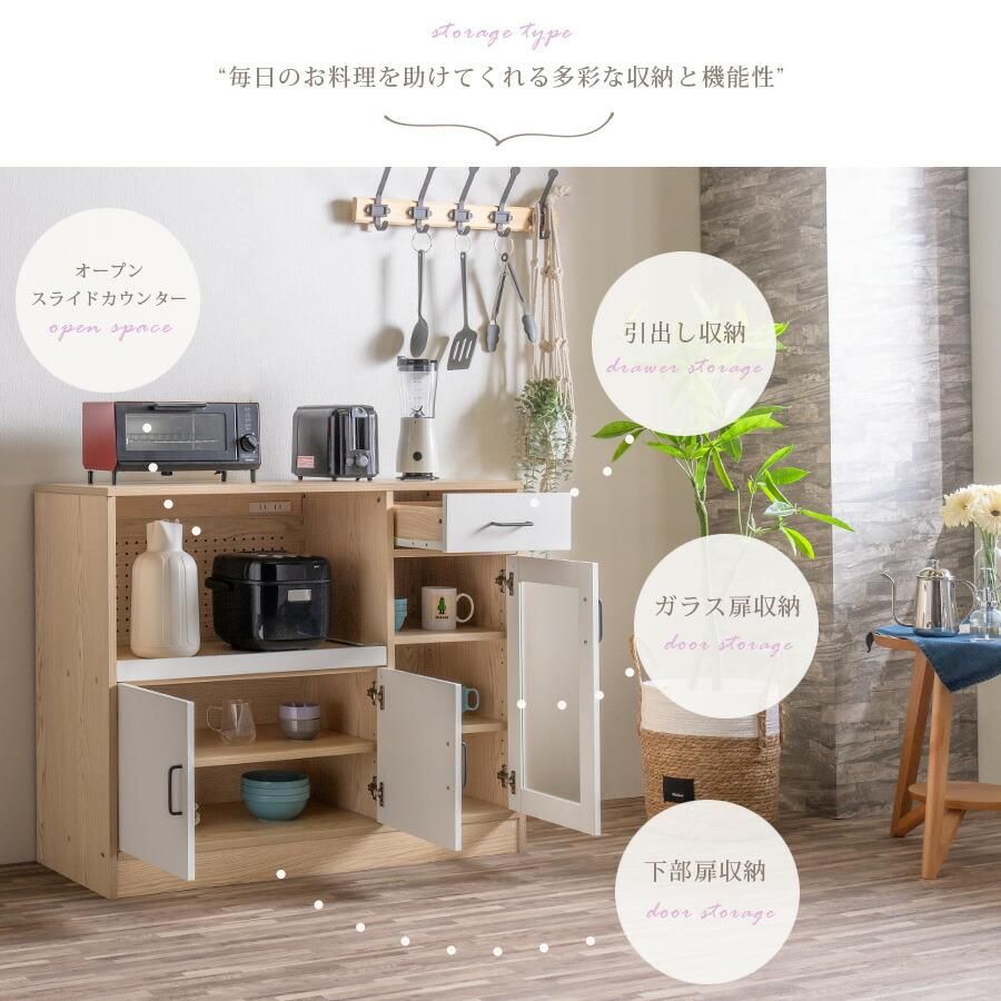 キッチンカウンター キッチン収納 レンジ台 引出し収納 扉収納 コンセント付き 可動棚 パステルカラー ホワイト ガラス扉 スライドカウンター かわいい