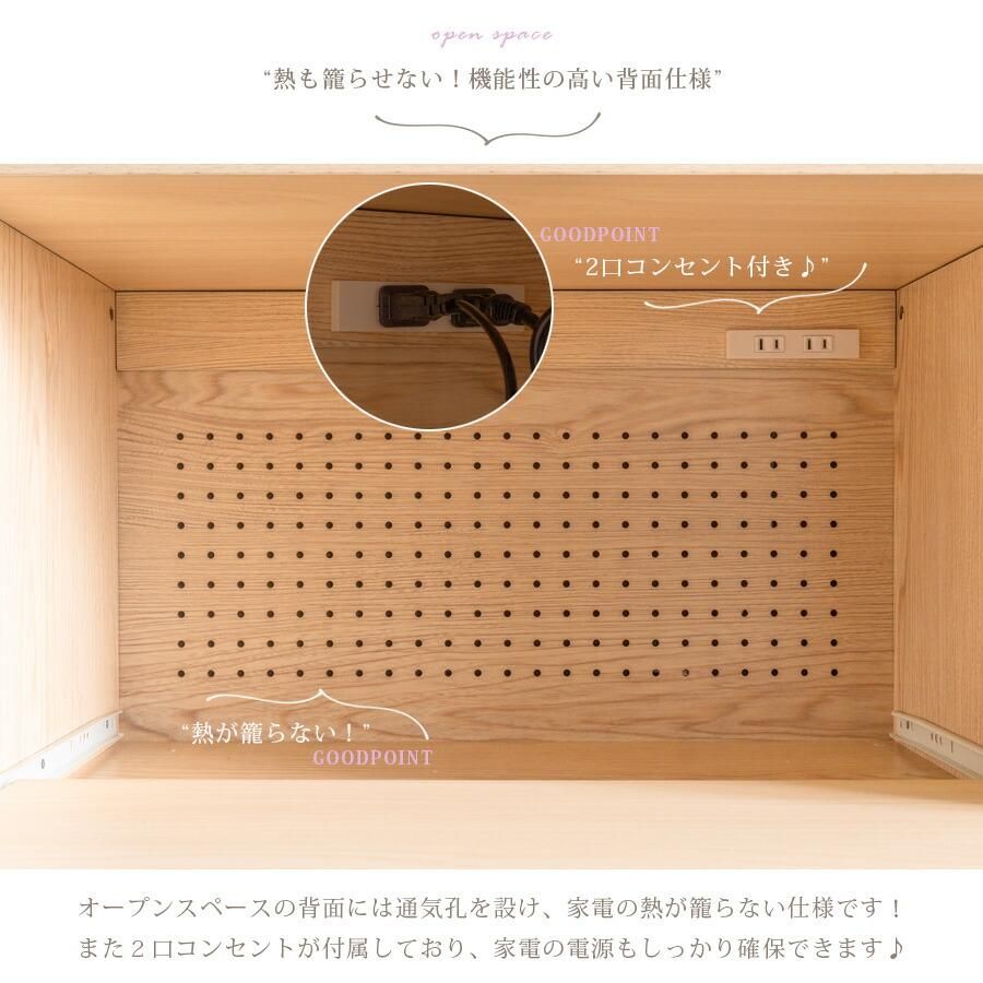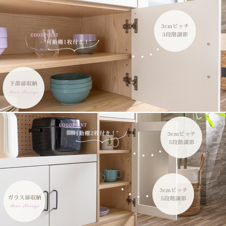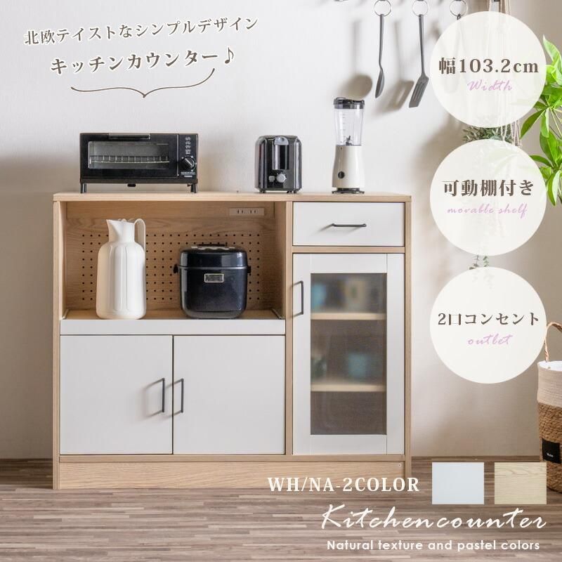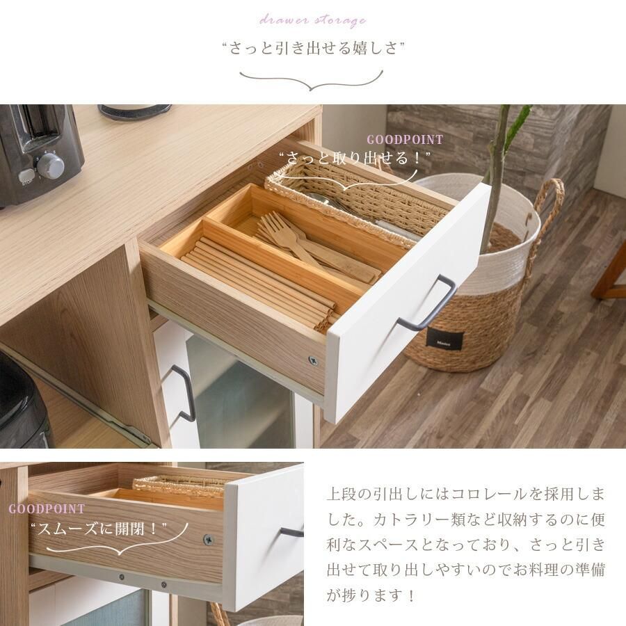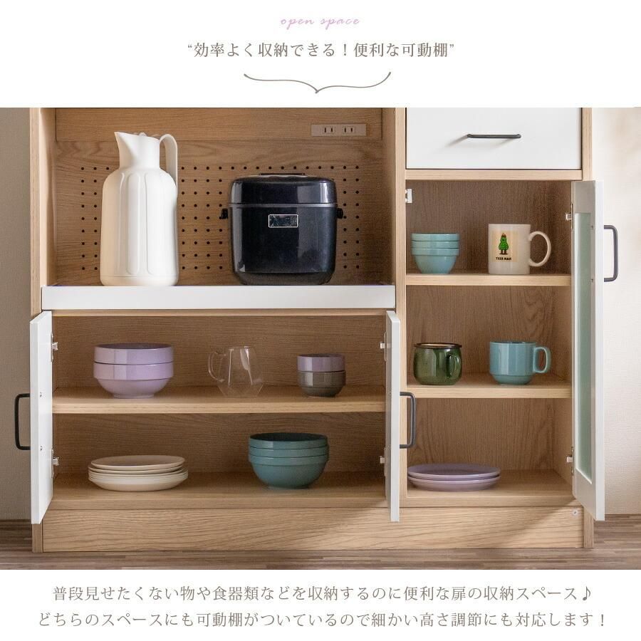 キッチンカウンター キッチン収納 レンジ台 引出し収納 扉収納 コンセント付き 可動棚 パステルカラー ホワイト ガラス扉 スライドカウンター かわいい