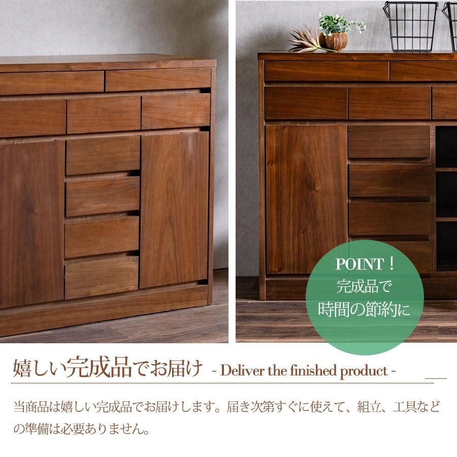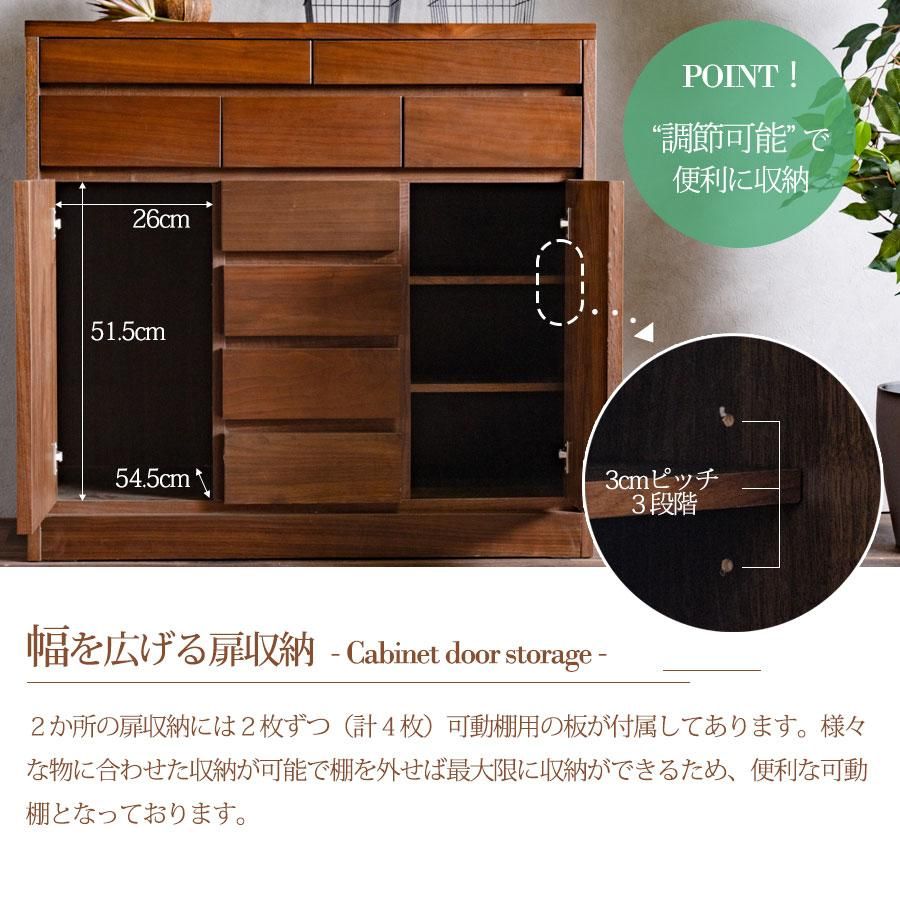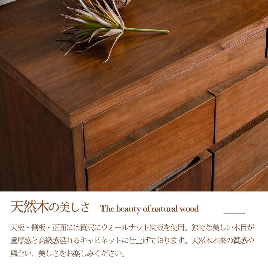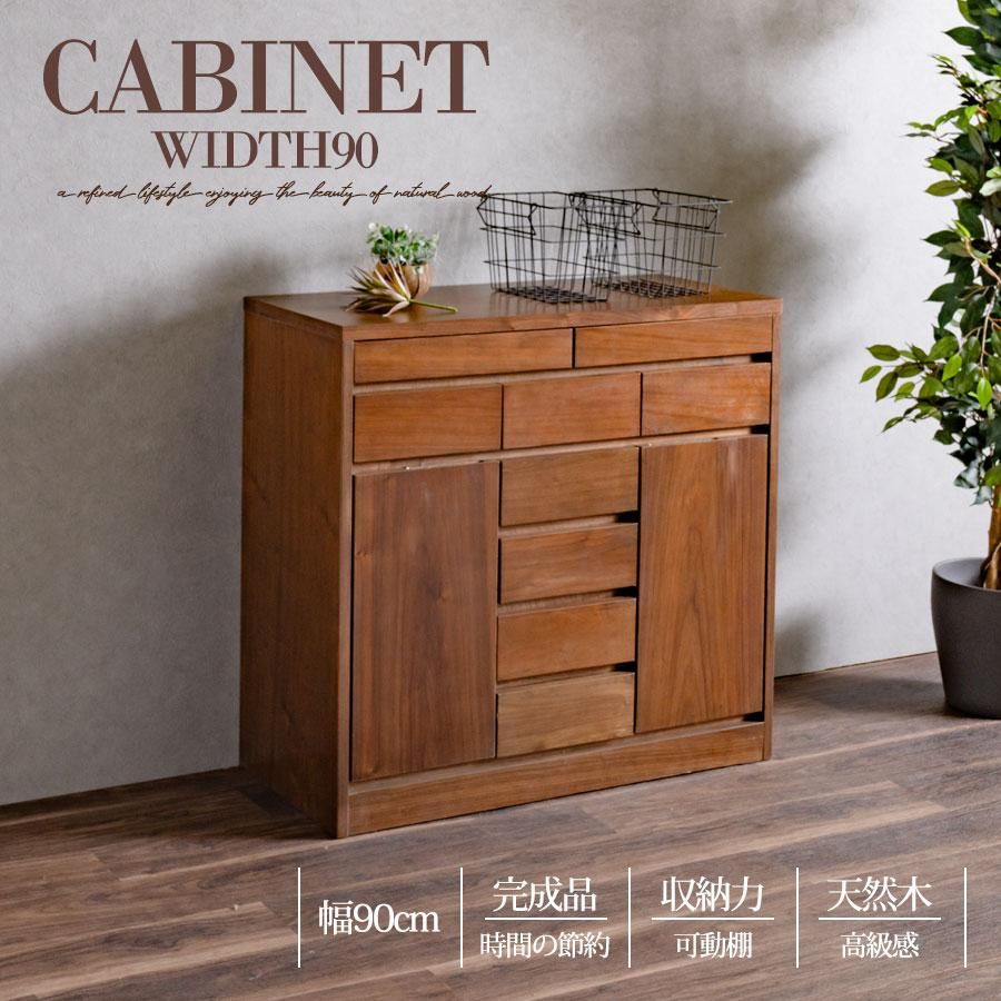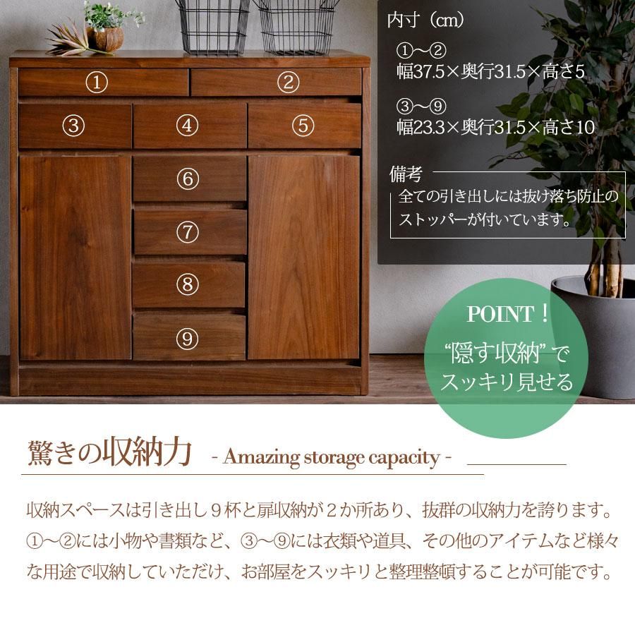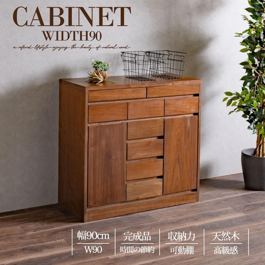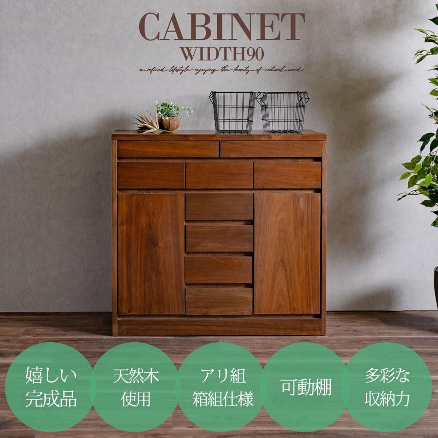 キャビネット 完成品 天然木 収納 可動棚 化粧仕上げ 90幅 幅90cm 引出し 扉 アリ組 箱組 北欧 モダン ブラウン ウォールナット突板 桐無垢材 インテリア